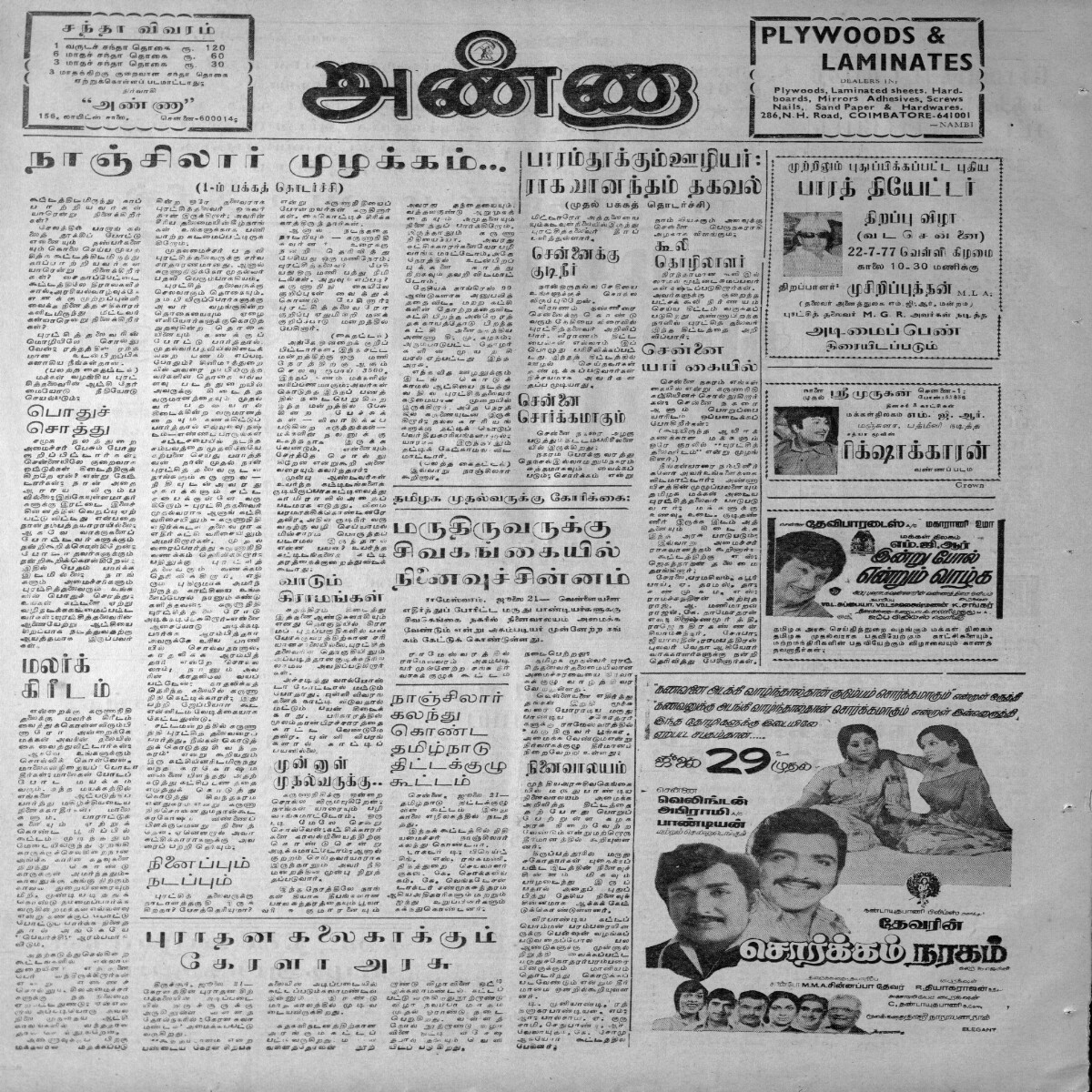- ^編集、編集 (1977 年 8 月 7 日)。「சொர்க்கம் – நரகம்」 [天国 – 地獄]。アンナ(タミル語)。 p. 3. 2025 年 11 月 19 日のオリジナルからアーカイブ。2025 年11 月 19 日に取得–絶滅危惧アーカイブ プログラム経由。